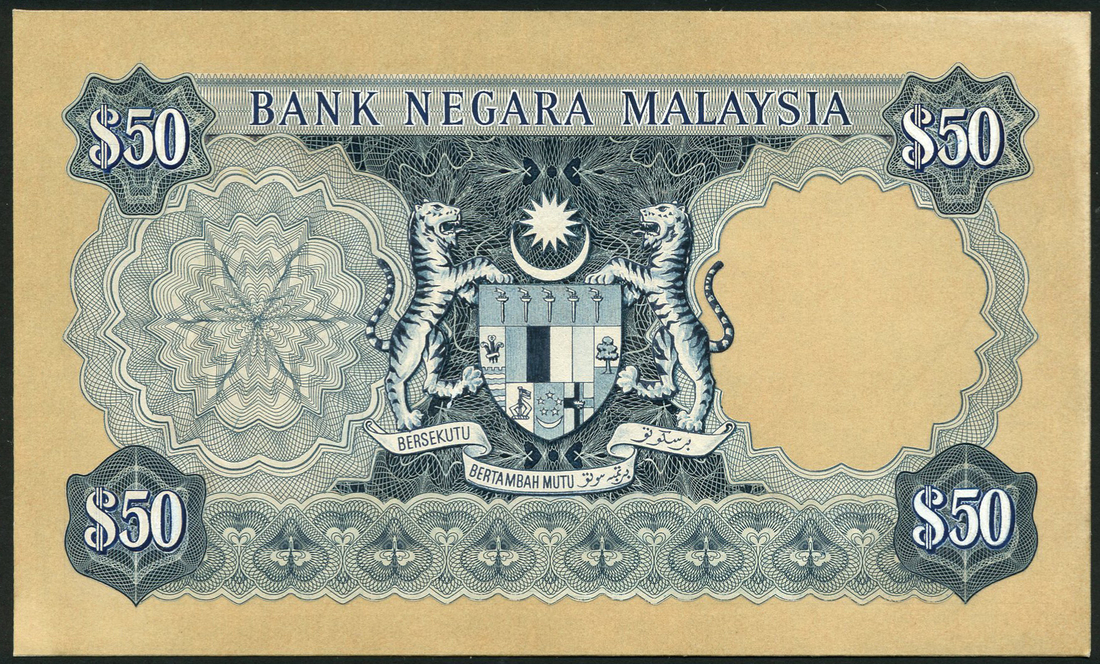 (†) Bank Negara Malaysia, printers archival composite essay on thin card for the reverse of a proposed issue of $50, ND (ca 1967), blue, arms at centre, value at each corner, ornate engine turnings in field