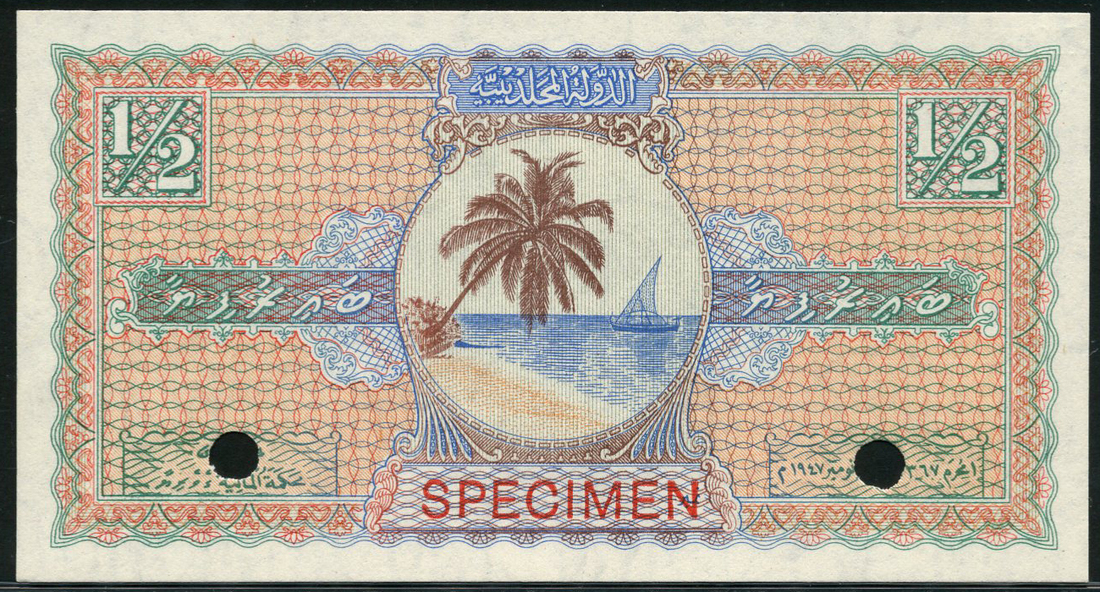 (†) Government of the Maldives, specimen 1/2 rufiyaa, 1947, no serial number, uniface, blue, brown, green and tan, sailing boat, beach and palm tree at centre, value at top left and right, red SPECIMEN overprint, two cancellation holes