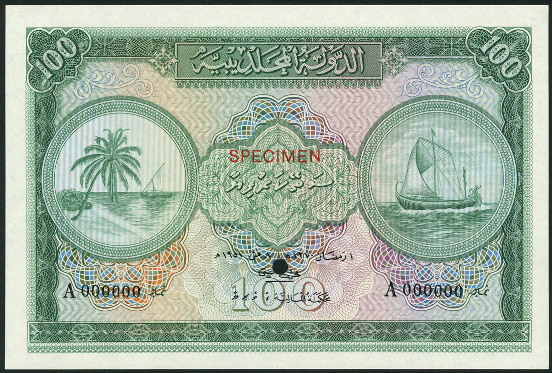 (†) Maldives State Issue, specimen 50 rupees, serial number A 000000, blue and multicoloured, also a specimen 100 rupees, serial number A 000000, green and multicoloured, both are dated 1951, both palm and dhow at left, dhow at right