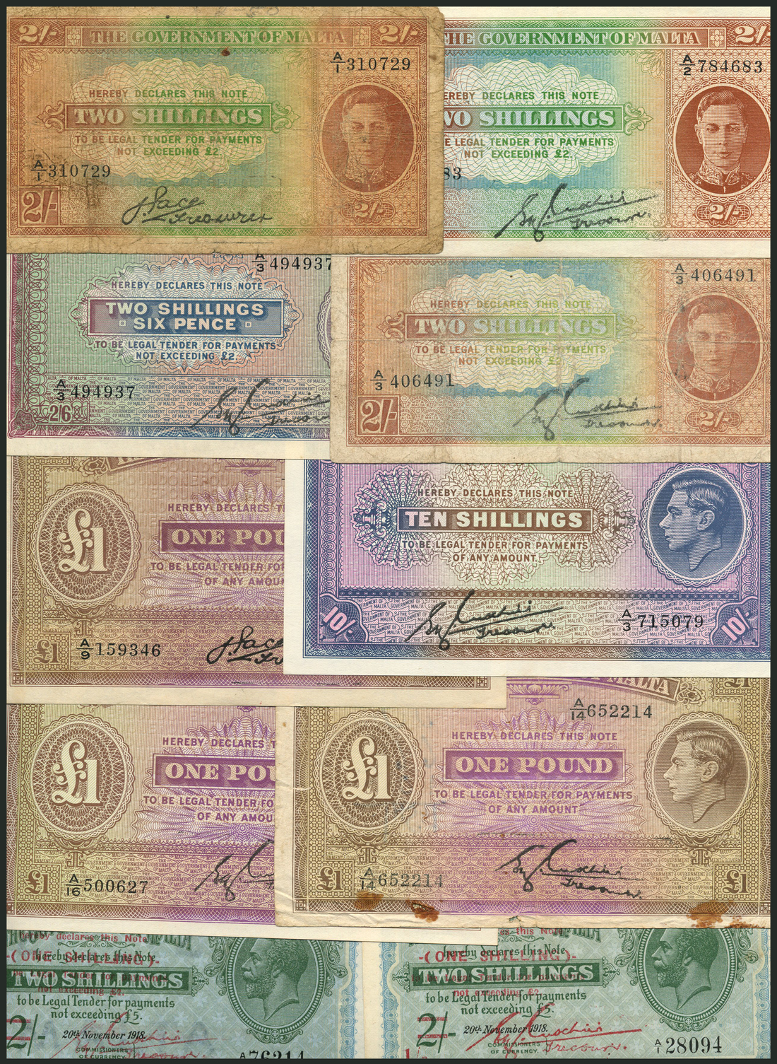 Government of Malta, a full set from the 1940 Issue comprising 1/- serial number A/1 063308, 2/- prefixes A/1, A/2, A/3, 2/- 6 pence prefix A/3, 10/- prefix A/3, £1 prefixes A/9, A/14, A/16, A/18 and a 1940 provincial issue 2/- with 1/- overprint, prefix A/1 (3)