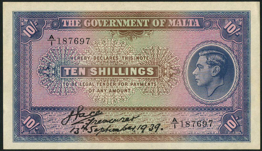 Government of Malta, a full set from the 1939 issue comprising 2 shilling 6 pence, serial number A/2 294652, 5 shillings, serial number A/1 429396, 10 shillings, serial number A/1 187697, £1 serial number A/1 053435