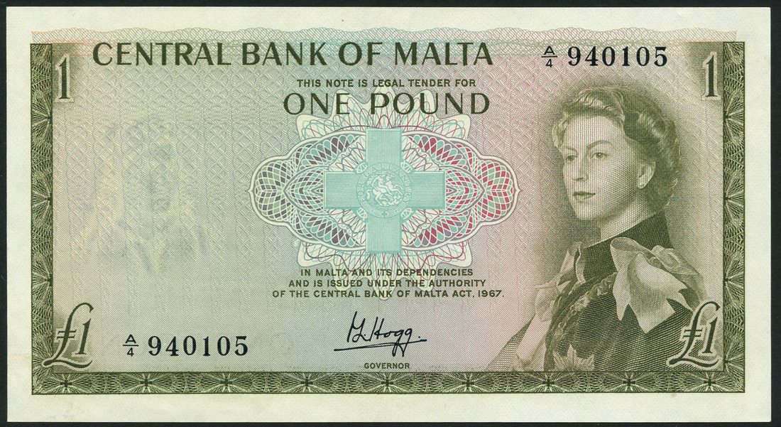 Government of Malta, 10/-, ND (1963), serial number A/2 193210, green on multicolour underprint, Elizabeth II at right, George Cross at centre, value at each corner, reverse Mgarr Harbour, 10/-, ND (1968), serial number A/4 234152, red, and £1, ND (1969), serial number A/4 940105, olive green, both with Elizabeth II at right, George Cross at centre