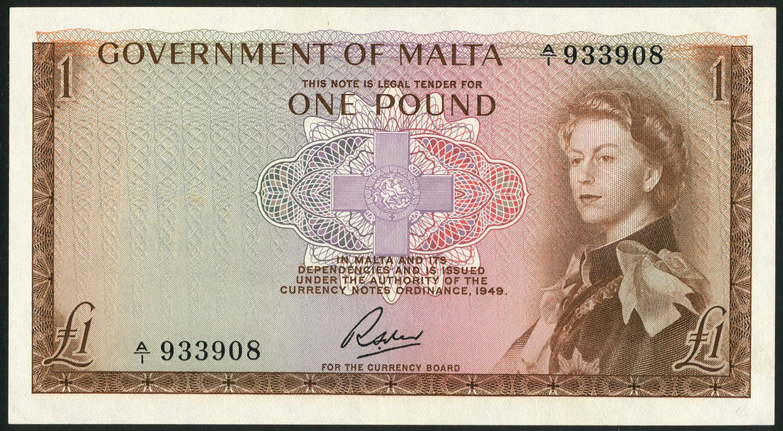 Government of Malta, 10/-, 1963, prefixes A/1(2), A/2, green, £1, 1963, serial number A/1933908, brown, R.Soler signature variety, Queen Elizabeth at right