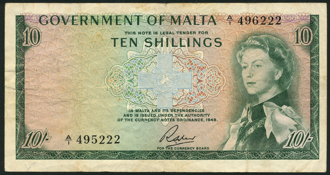 Government of Malta, ERROR: 10/-, (ND) 1963, mismatched serial numbers A/1 495222 and A/1 496222, green on multicolour, Annigoni portrait of Queen Elizabeth II at right, reverse Mgarr Harbour, Gozo