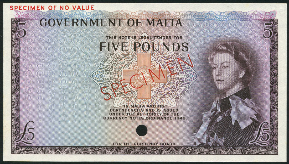 Government of Malta, £1, ND (1963), serial number A/3 794531, brown and multicoloured, Elizabeth II at right, George Cross at centre, Soler signature, reverse brown, also colour trial £5, ND (1963), no serial number, red SPECIMEN overprint, purple, brown and multicoloured, Elizabeth II at right, George Cross at centre, reverse purple, brown, one hole punch low centre