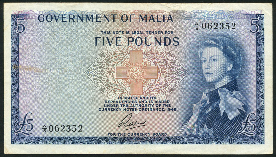 Government of Malta, £5, 1963, serial number A/5 062352, R.Soler signature variety, blue on multicolour, Annigoni portrait of Queen Elizabeth II at right, reverse Grand Harbour, Valetta