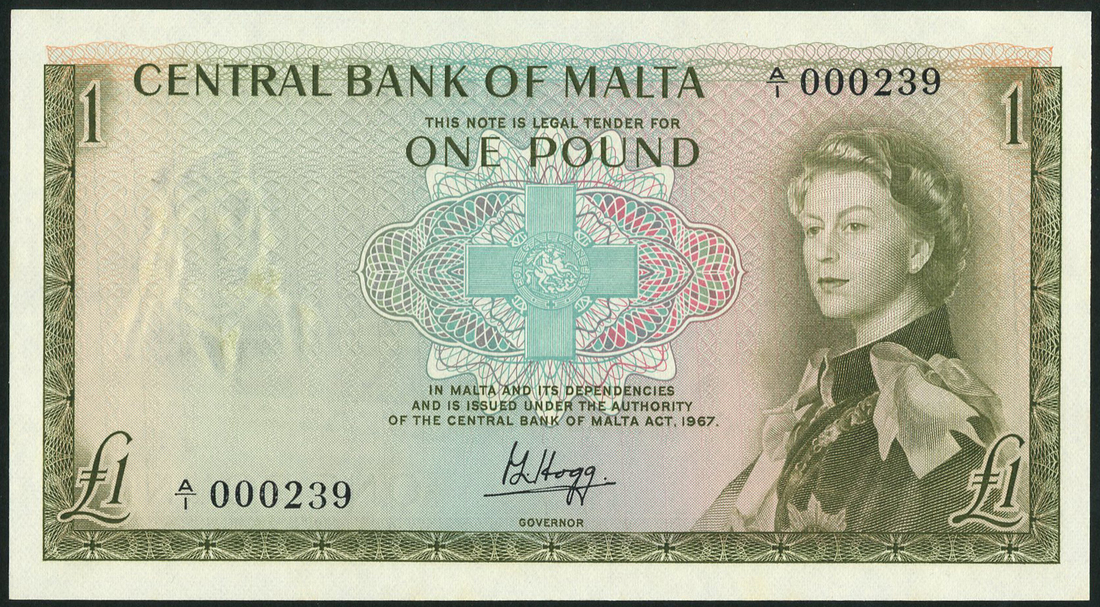 Central Bank of Malta, 10 shillings (2), ND (1968), serial number A/1 000977 and A/3 826555, red and multicoloured, £1, ND (2) (1968), serial number A/1 000239 and A/9 672099, green and multicoloured, all Elizabeth II at right, George Cross at centre, reverse red