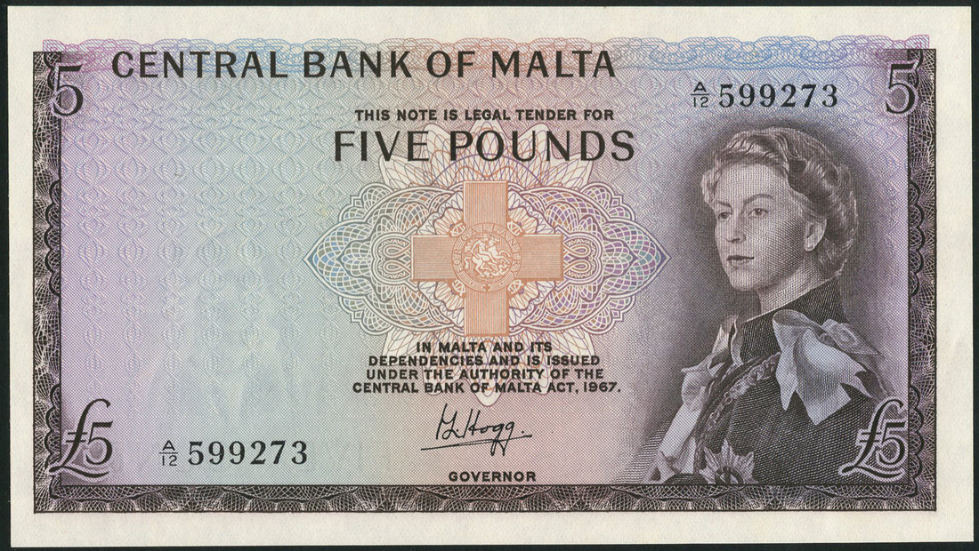 Central Bank of Malta, a set from the 1968 issue, P.L.Hogg signature variety, 10/- serial numbers A/3 610216 and 621394, £1, low serial number A/1 000213, £5, serial number A/12 599273