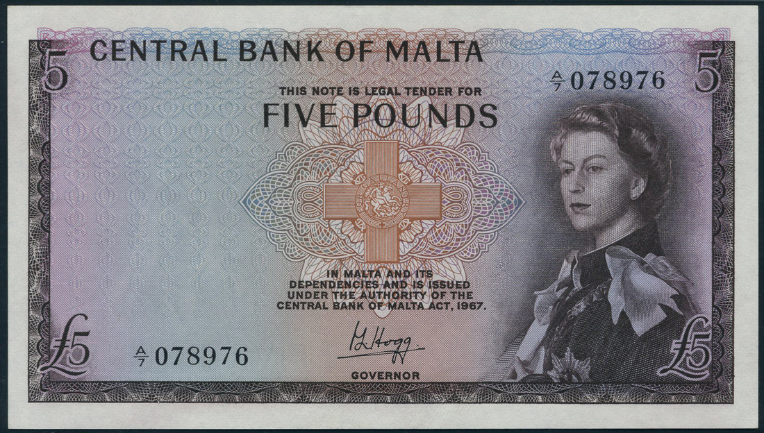 (x) Central Bank of Malta, £5, ND (1968), serial number A/7 078976, purple-brown and multicoloured, Elizabeth II at right, George Cross at centre, Hogg signature