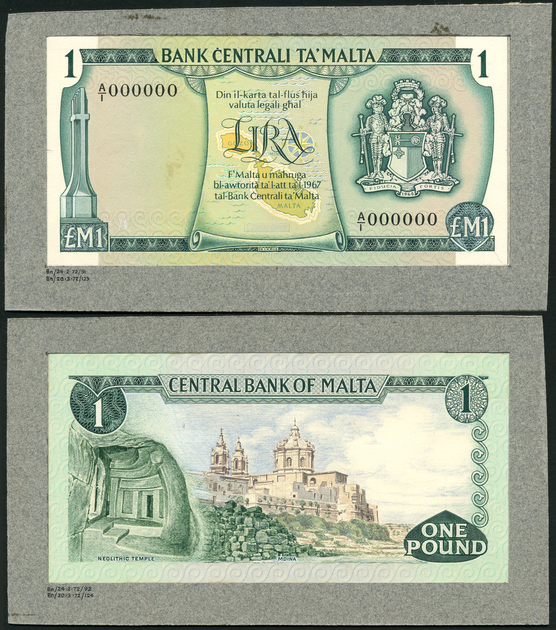 (†) Central Bank of Malta, a printers obverse and reverse archival composite essay on card for a proposed issue of 1 lira, ND (1972), serial number A/1 000000, green and pink, map of Malta low centre, arms at right, Hogg signature, reverse green, Neolithic Temple at low left at left, the city of Medina at centre, value at left and right