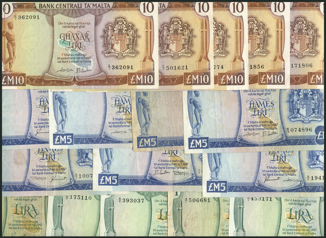 Central Bank of Malta, £10, ND (1972), prefixes C/1, C/2, C/3, C/4, C/7, brown and multicoloured, £5, prefixes B/3, B/4, B/5, B/6 B/7 (2), B/14, blue, £1 prefixes A/1 (2), A/4, A/9, A/12, A/17, A/21, A/24, A/26, green, arms at right, map at centre