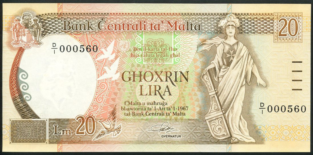 Central Bank of Malta, a full set from the 1967 (1989) issue, comprising 2 liri, prefix A/1, 5 liri, prefix B/1, 10 liri, prefix C/1 and 20 lira, prefix D/1, all with serial number 000560,