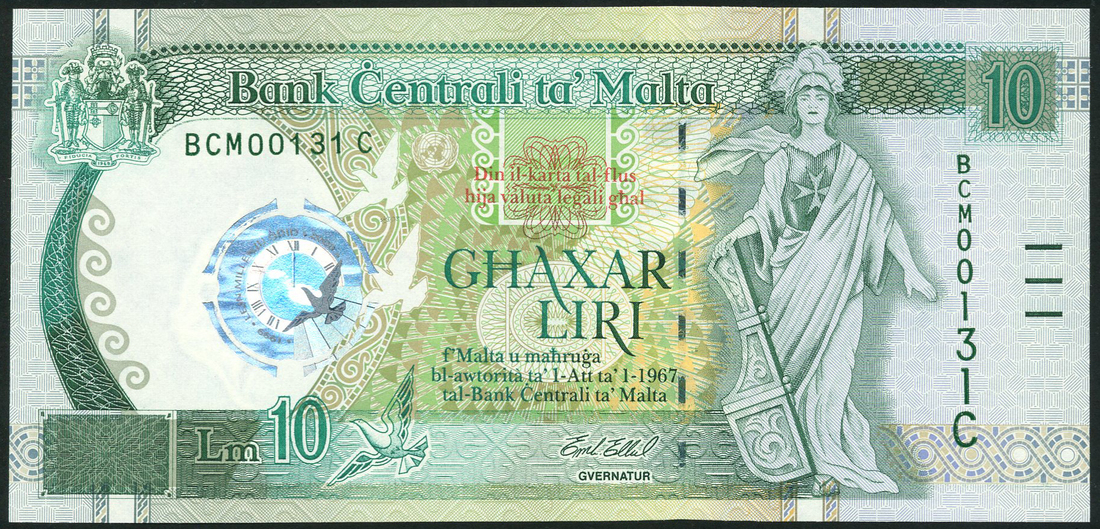 Central Bank of Malta, a full set from the 2000 commemorative issue, comprising 2 liri, serial number BCM00131A, 5 liri BCM0013B, 10 liri BCM 00131C, with holographic overprint at left