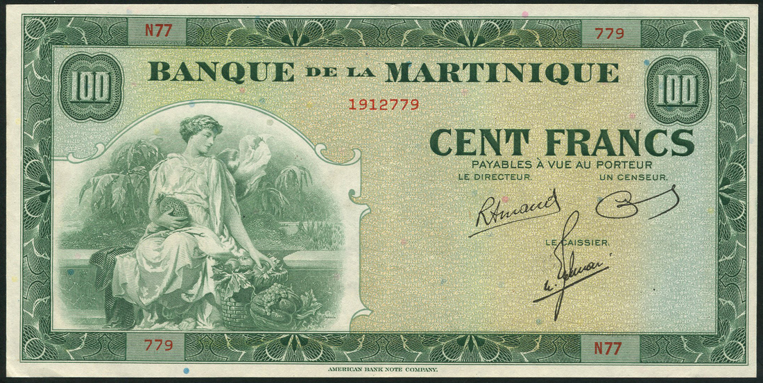 Banque de la Martinique, 100 francs, ND (1942), red serial number N77-779, green and pale orange, maiden and fruit at left, three printed signatures at right