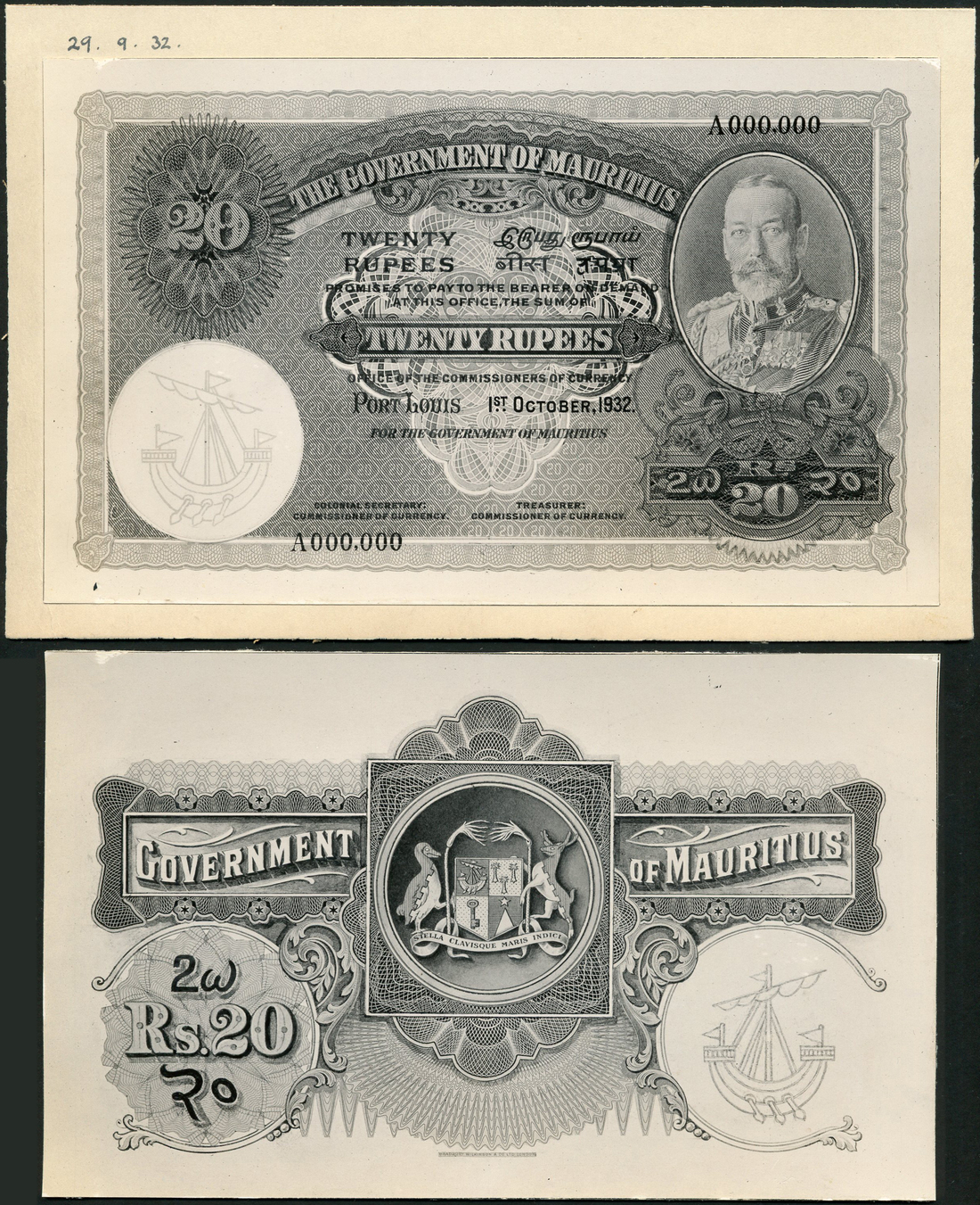 Government of Mauritius, obverse and reverse printers archival photographs for 20 rupees, 1 October 1932, black and white, George V at right, representation of a ship watermark at low left, reverse with arms at centre, value at low left