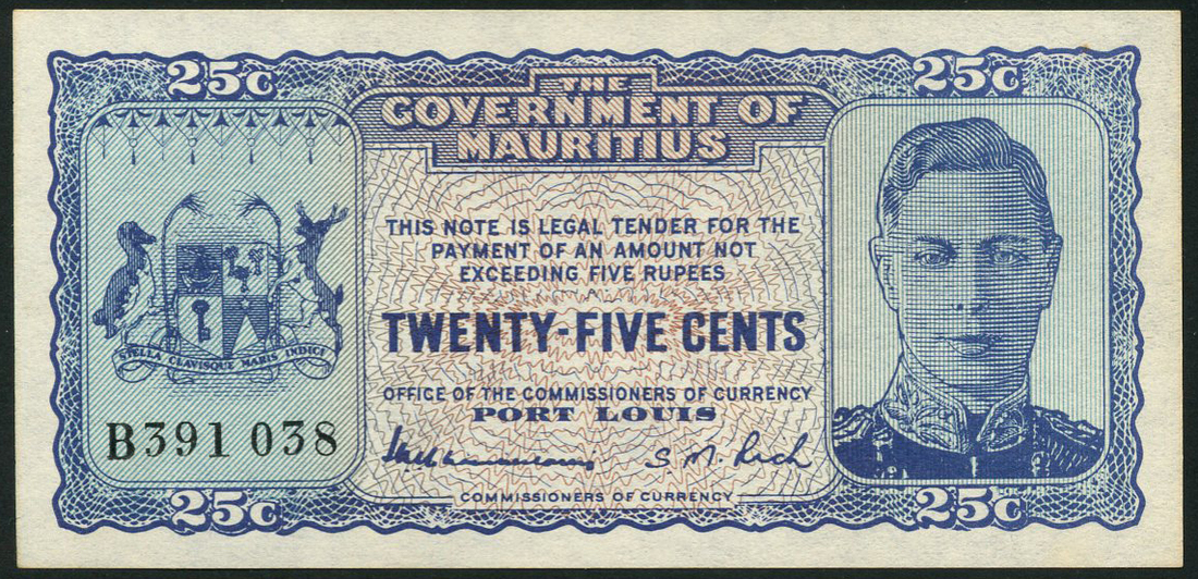 (x) Government of Mauritius, 25 cents, ND (1940), serial number B391 038, uniface, blue and pale lilac, portrait King George VI at right, arms at left, value top left and right and low left and right