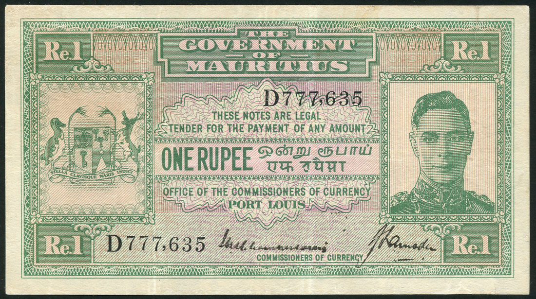 (x) Government of Mauritius, 1 rupee, ND (1940), serial number D777,635, green and lilac, portrait King George VI at left, arms at right, each in ornate square frame, reverse, colourful geometric panel