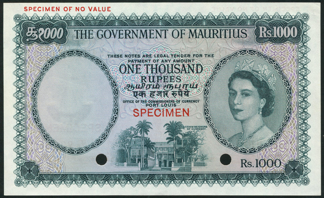 (x) Government of Mauritius, colour trial 1000 rupees, ND (1954), no serial number, green on lilac underprint, portrait Queen Elizabeth II at right, view of Port Louis low centre, reverse, light brown, arms at centre, red stamp SPECIMEN at centre, hole punched low left and right