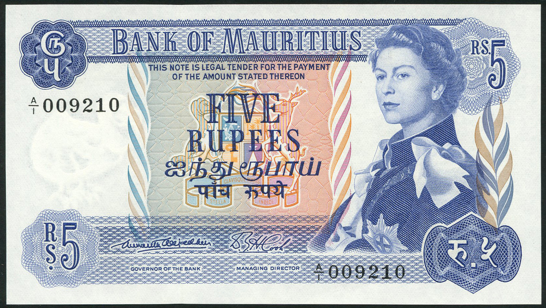 Bank of Mauritius, 5 rupees (2), ND (1967), serial numbers A/1 009210 and 009211, blue on multicolour underprint, Elizabeth II at right, value at centre and each corner, reverse, purple, shoreline and sailing boat