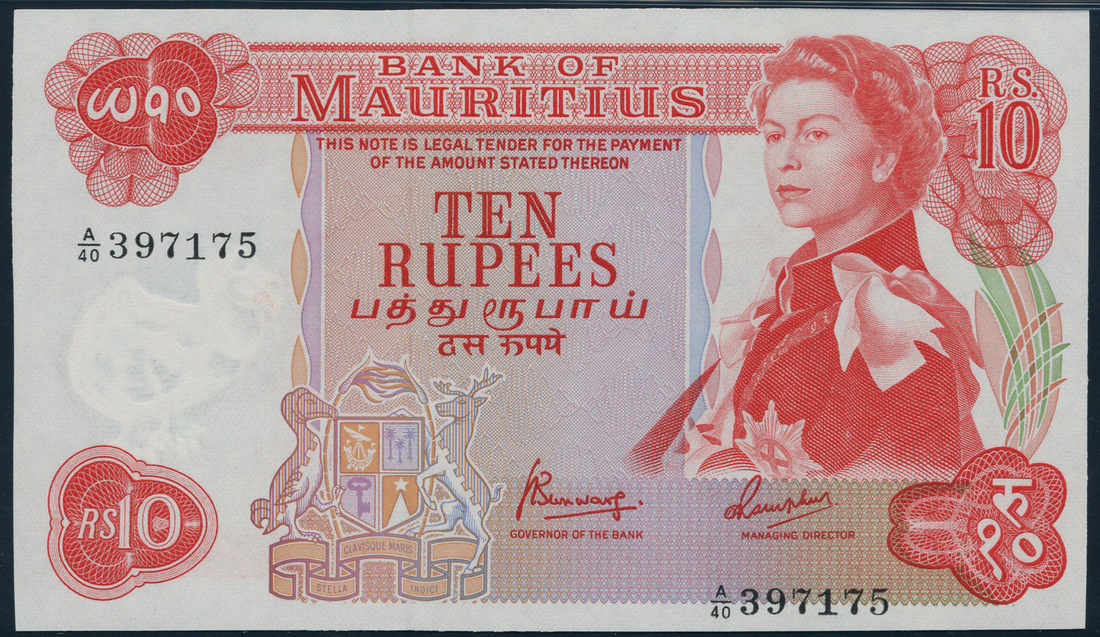 (x) Bank of Mauritius, 10 rupees, ND (1967), serial number A/40 397175, red, coat of arms lower left, Queen Elizabeth II at right