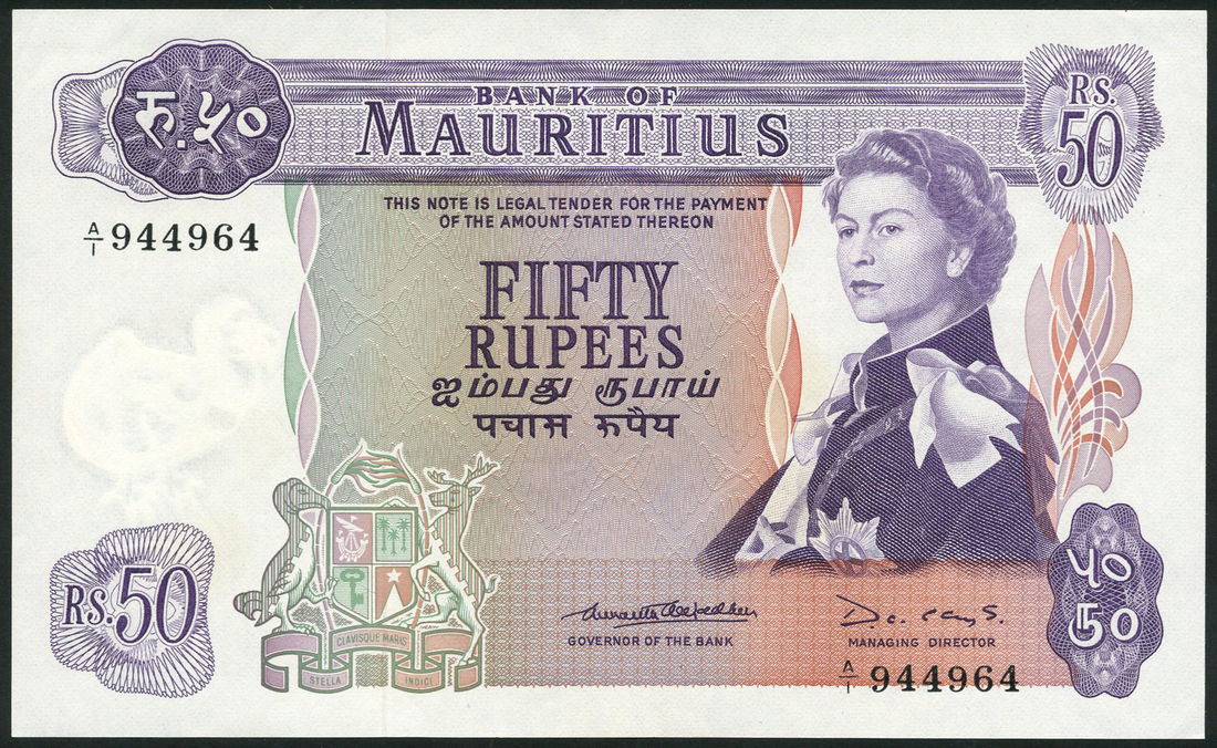 Bank of Mauritius, 50 rupees, ND (1967), serial number A/1 944964, purple and multicolour, portrait Queen Elizabeth II at right, arms centre left, value top left and right, centre, low left and right, reverse, purple, oil tankers in Port Louis harbour, mountains in background