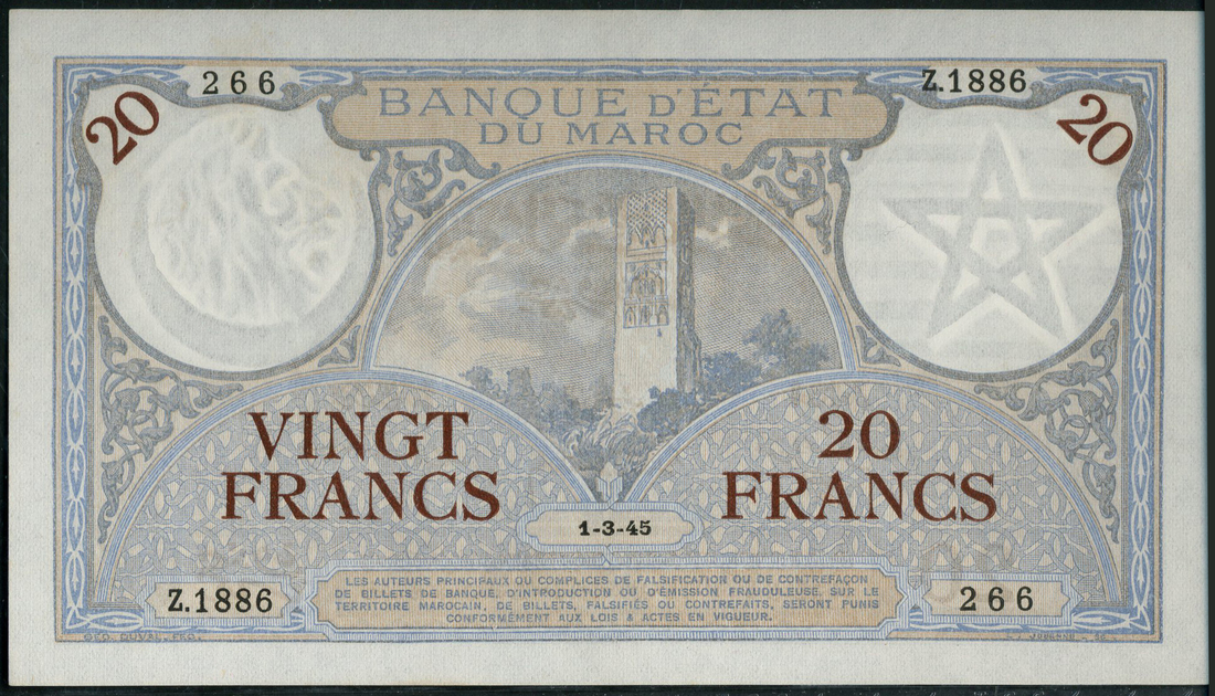 Banque d'Etat du Maroc, 20 francs, 1943, 5 francs, 1941 and 5 francs, 1943, multicolour, ornate designs and values on face, first with tower at centre
