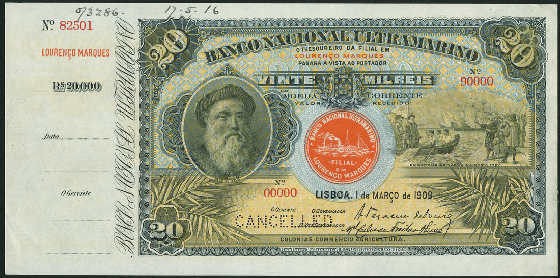 (†) Banco Nacional Ultramarino, Mozambique, printer's archival specimen 20 Mil Reis with counterfoil, 1 March 1909, serial number run 00000 to 90000, black on blue and yellow underprint, portrait of Vasco da Gama at left, his embarkation at right, steamship seal Type I at lower centre, red overprint LOURENCO MARQUES at upper centre, reverse orange-red, allegorical woman looking out at sailing ships, perforated CANCELLED