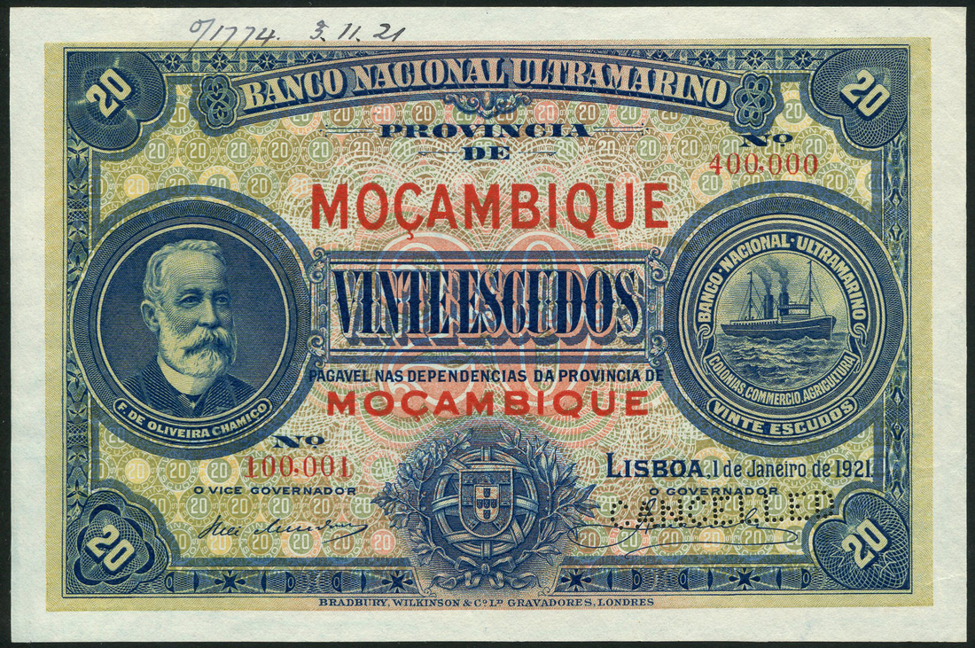 (†) Banco Nacional Ultramarino, Mozambique, a group of printer's archival specimens, all 1 January 1921, comprising 1 Escudo, serial run 1,600,001 to 2,760,000, green; 5 Escudos, serial run 1,000,001 to 1,026,000, black-brown; 10 Escudos, serial run 180,001 to 380,000, brown-purple; and 20 Escudos, serial run 100,001 to 400,000, blue, all Francisco de Oliveira Chamico at left, steamship seal at right, arms at lower centre, without Decreto, reverse woman looking out at ships, perforated CANCELLED
