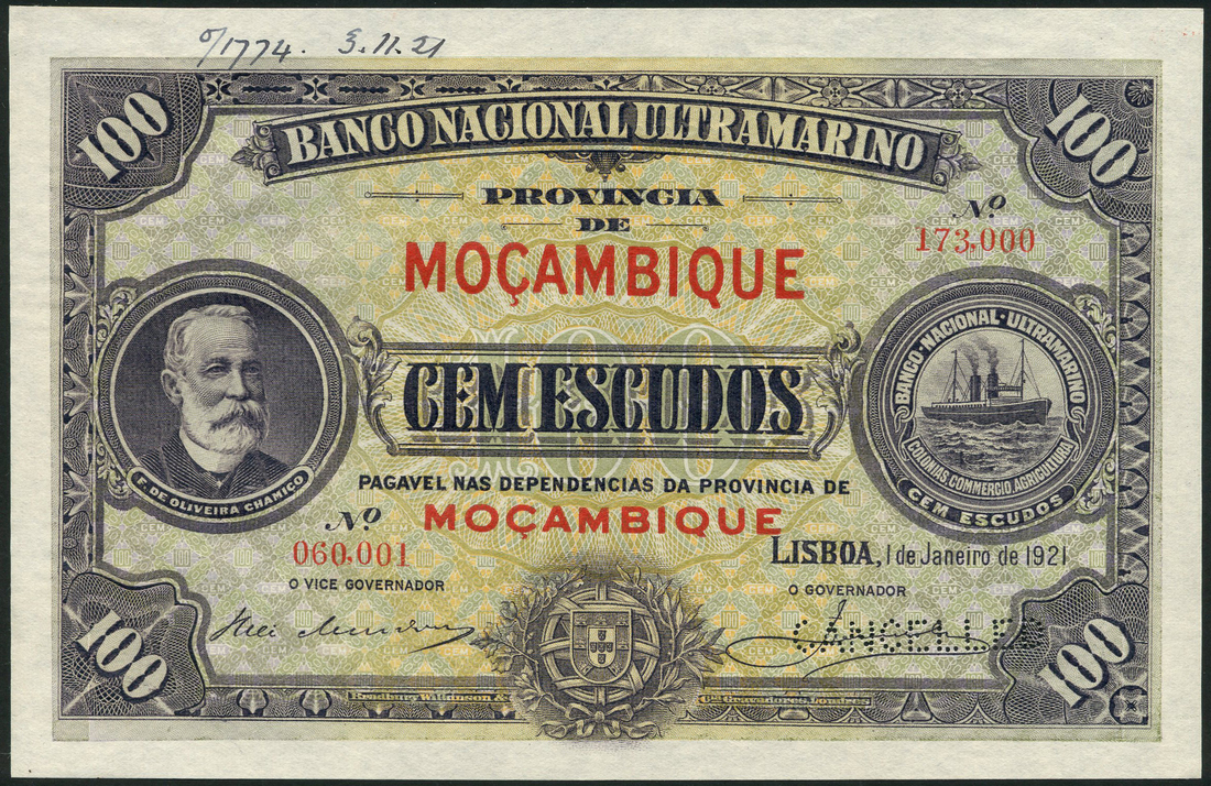 (†) Banco Nacional Ultramarino, Mozambique, printer's archival specimen 100 Escudos, 1 January 1921, serial number run 060,001 to 173,000, slate-violet on pale green and multicoloured underprint, Francisco de Oliveira Chamico at left, steamship seal at right, arms at lower centre, without Decreto, reverse woman looking out at ships, perforated CANCELLED