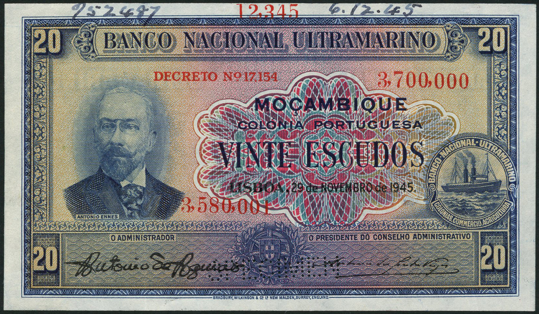 (†) Banco Nacional Ultramarino, Mozambique, a group of printer's archival specimens, 29 November 1945, comprising 5 Escudos, serial run 2,785,001 to 3,110,000, green; 10 Escudos, serial run 1,395,001 to 1,555,000, brown-purple; and 20 Escudos, serial run 3,580,001 to 3,700,000, blue, all portrait of Antonio Ennes at left, steamship seal at right, arms at lower centre, reverse woman looking out at ships, perforated SPECIMEN