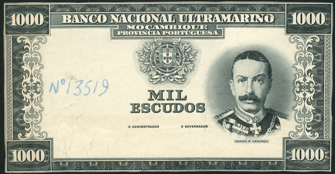 (x) Banco Nacional Ultramarino, Mozambique, an obverse and reverse printers archival die proof for a 100 escudos, black and white, an obverse and reverse die proof 500 escudos, black and white, an obverse and reverse die proof 1000 escudos, black and white and another reverse 1000 escudos, all ND (ca 1950),