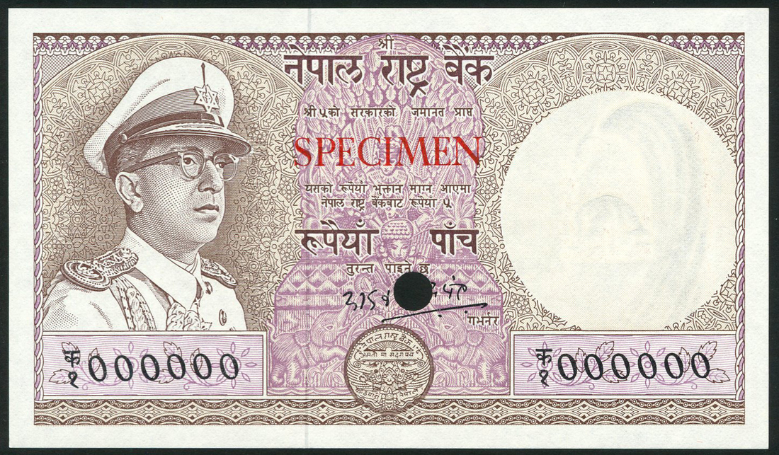 (†) Nepal Rastra Bank, specimen colour trial, 5 rupee, 1970, zero serial number brown and violet, King Mahendra at left, watermark at left, cancel hole, red SPECIMEN overprint