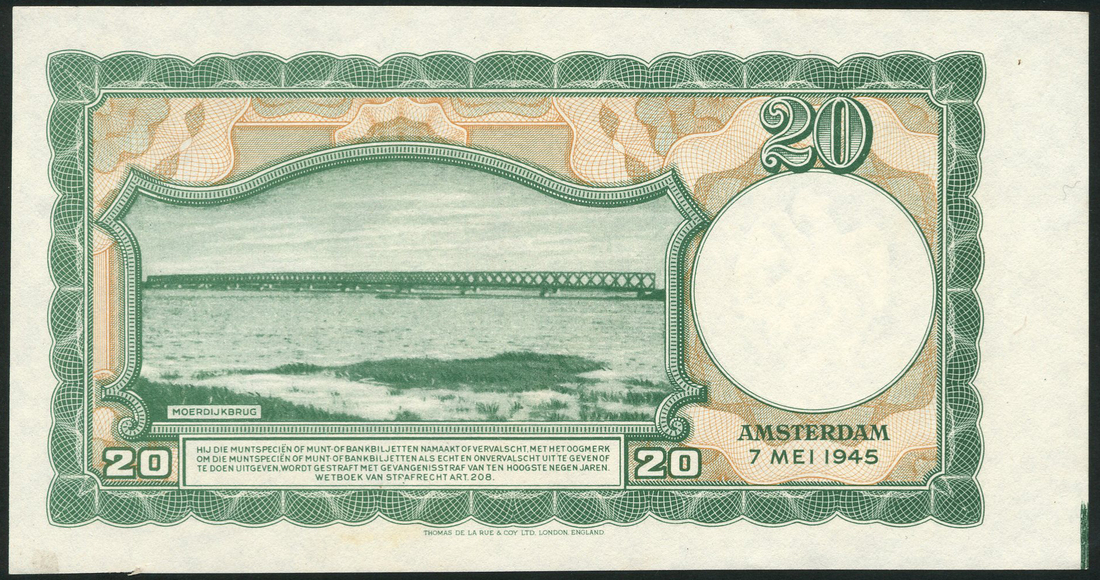 De Nederlandsche Bank, reverse and partial obverse proofs (2) for 20 gulden, 7 May 1945, with a fully printed reverse and only the underprint on the obverse, Moerdyk Bridge at centre-left