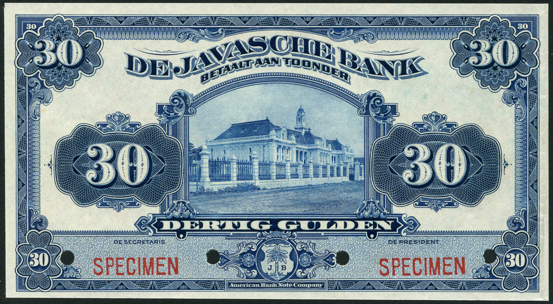 De Javasche Bank, Netherlands Indies, specimen 30 gulden, ND (ca 1919), blue and white, bank building at centre, value at left and right and low centre, reverse blue and multicoloured, value in field