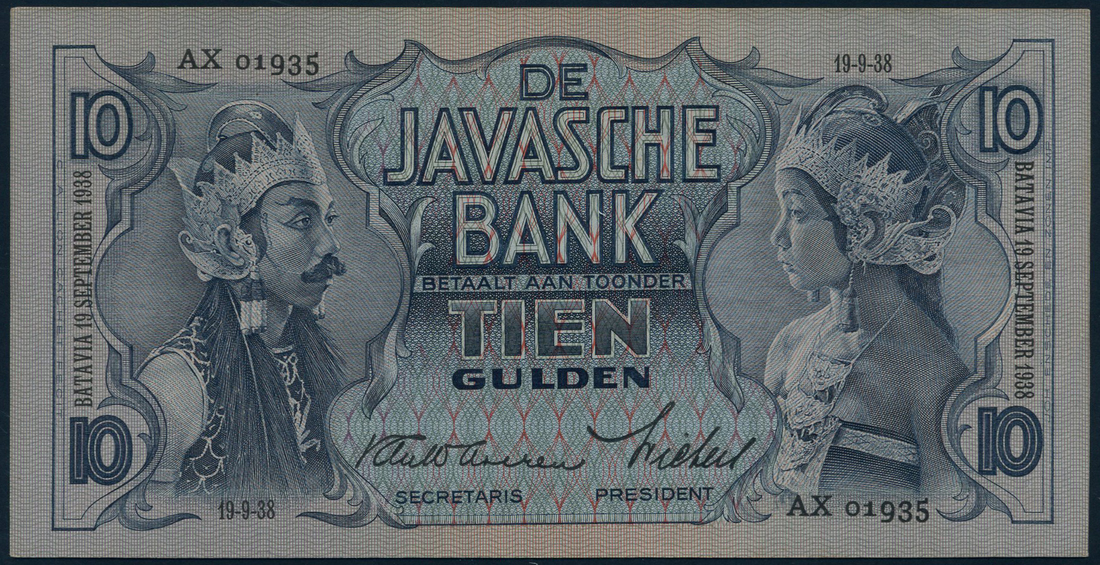 (x) De Javasche Bank, Netherlands Indies, a consecutive trio of 5 gulden, 1939, serial number PG 08945-47, brown on light brown and green, 10 gulden, 1938, serial numbers AX 01935 and 01937, dark blue on light blue and pink, all with J.C. Van Waveren signature variety