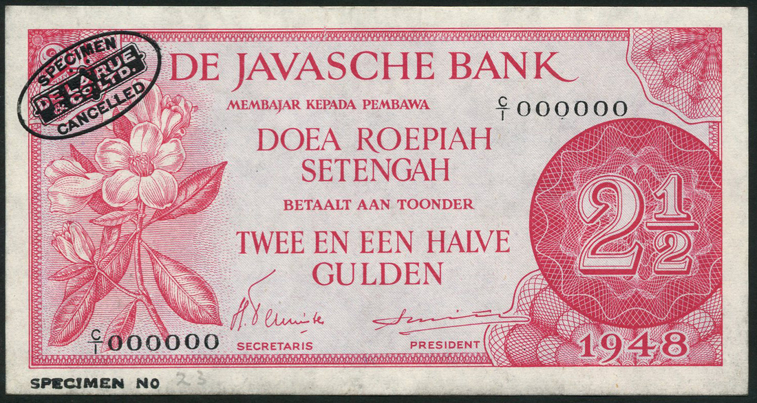 De Javasche Bank, Netherlands Indies, specimen 1/2 rupiah,1948, prefix A/1, violet and pale blue-green, specimen 1 rupiah, 1948, prefix B/1, blue and pink, specimen 2 1/2 rupiah, 1948, prefix C/1, red, all flowers or trees at left, value at right
