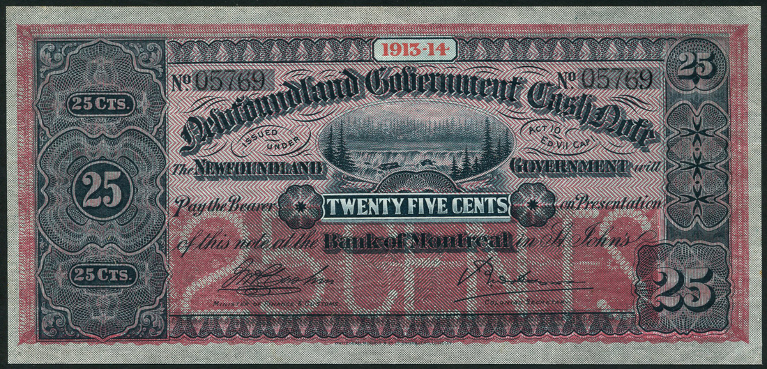 Newfoundland Government Cash Note, 25 cents, 1913-14, serial number 05769, black on red and pink underprint, vignette of forest and waterfall top centre, value ornate panels at left and right, reverse, orange and blue guilloche with value at centre