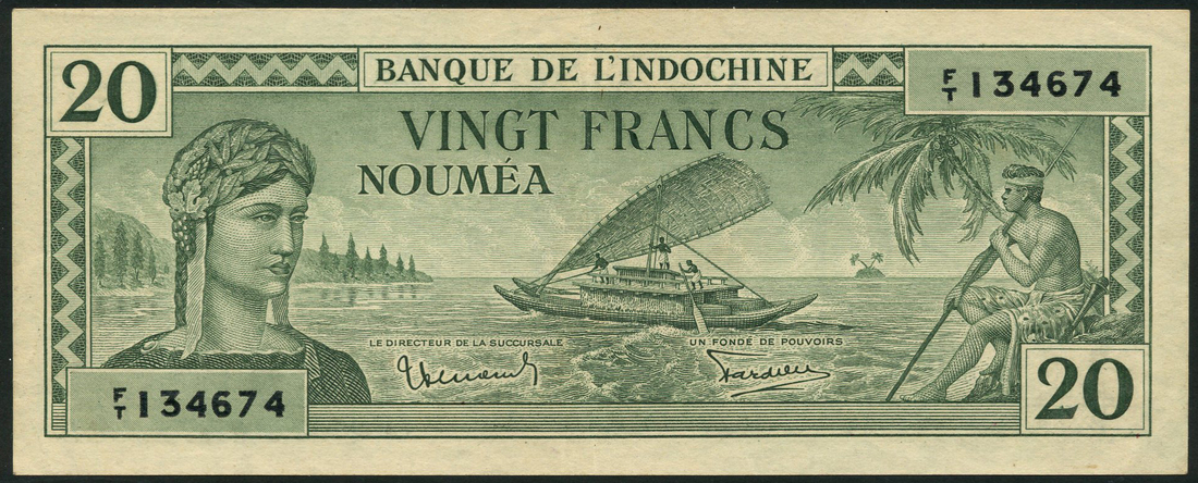 (x) Banque de l'Indochine, Noumea, 20 francs, ND (1944), serial number F/T 134674, green, woman with wreath in her hair at left, catamaran canoe at centre, fisherman at right