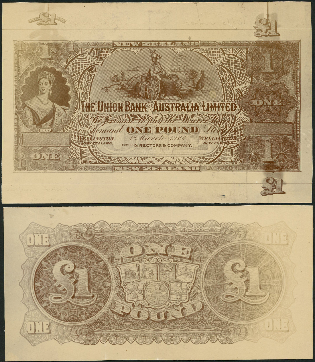 Union Bank of Australia Limited, New Zealand, obverse and reverse printers archival photographs of a design for the Wellington, New Zealand issue of 1923, black and white, Victoria at left, Britannia and symbols of trade and commerce at top centre, value at centre, right and at each corner, reverse, coats of arms and values