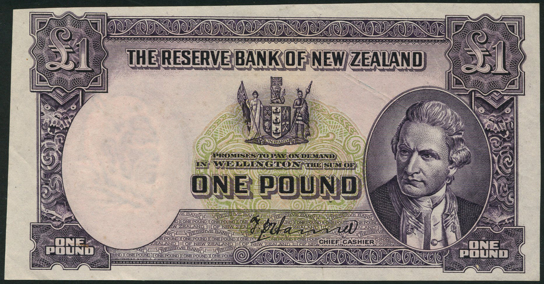 Reserve Bank of New Zealand, remainders, possibly printers waste for 10/- and £1, ND (1940-67), no serial numbers, brown and purple respectively, Cook at right, arms at centre, no security thread but watermarked paper