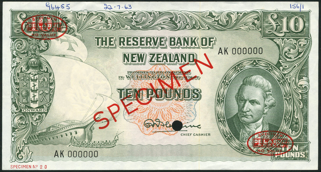 (†) Reserve Bank of New Zealand, specimen £10, ND (1967), serial number AK 000000, green and pale pink-orange, Captain Cook at right, the 'Endeavour' at left, Fleming signature, reverse green, flock of sheep