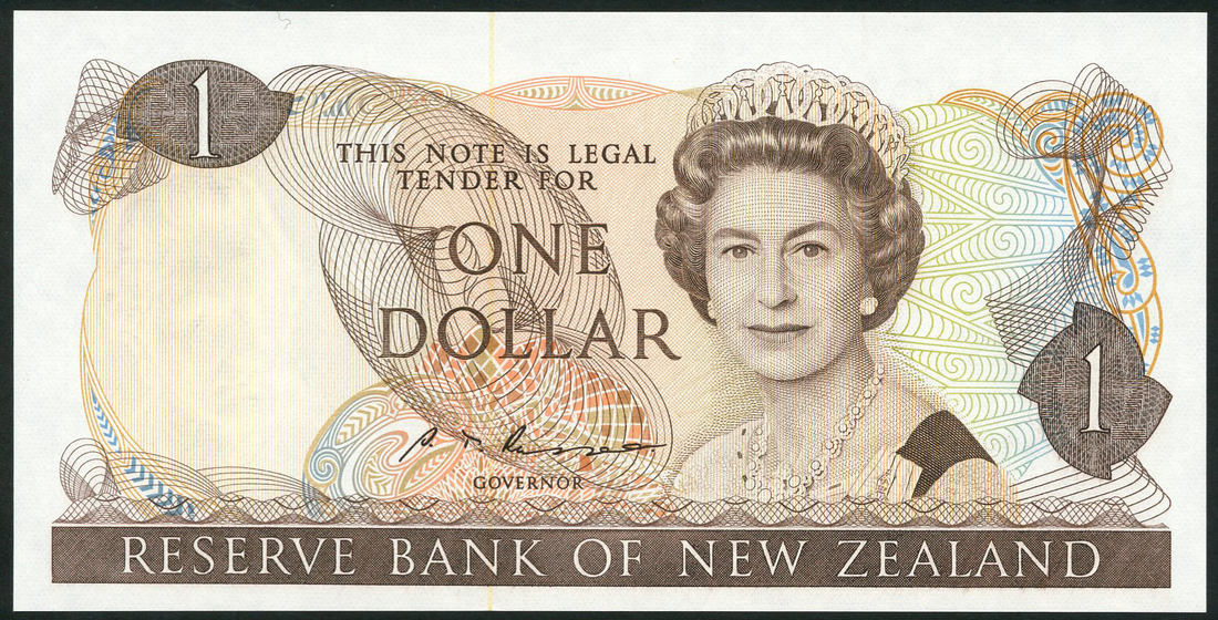 Reserve Bank of New Zealand, specimen proof $1, ND (1985), no serial numbers, signature S. T. Russell, brown on multicoloured underprint, mature portrait of Queen Elizabeth II at right, reverse clematis at left, fantail at centre