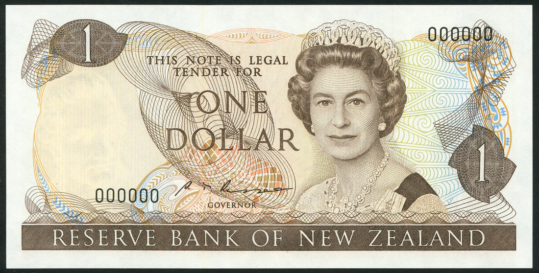 Reserve Bank of New Zealand, specimen $1, ND (1985), serial number 000000, signature S. T. Russell, brown on multicoloured underprint, mature portrait of Queen Elizabeth II at right, reverse clematis at left, fantail at centre