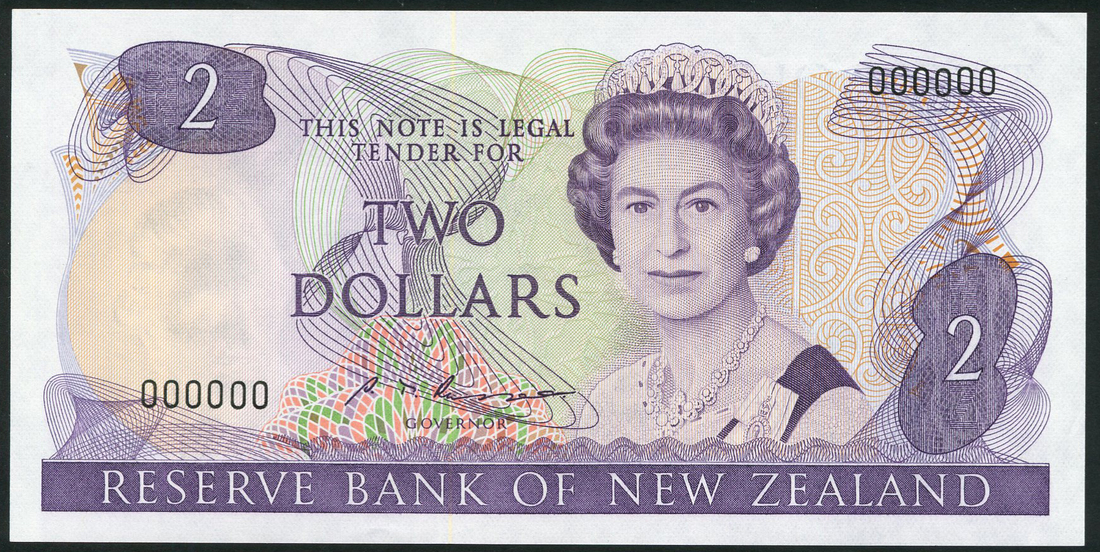 Reserve Bank of New Zealand, specimen $2, ND (1985), serial number 000000, signature S. T. Russell, purple on multicoloured underprint, mature portrait of Queen Elizabeth II at right, reverse mistletoe at left, rifleman at right