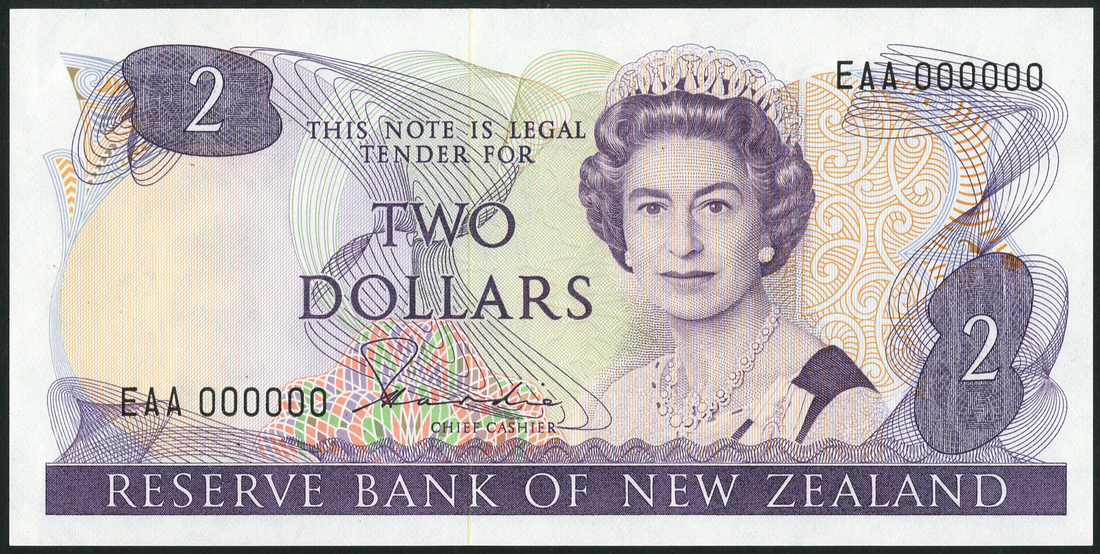 Reserve Bank of New Zealand, specimen $2 (2), ND (1981), prefixes EEC, EAA, purple, Elizabeth II at right, Hardie signature, also $1 and $2, 1967-75, brown and purple respectively