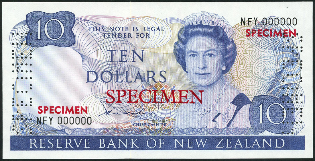 Reserve Bank of New Zealand, specimen $10 (3), ND (1981), prefixes NFY, NHG, NHG, blue, Elizabeth II at right, Hardie signature, two with red SPECIMEN overprint and perforation