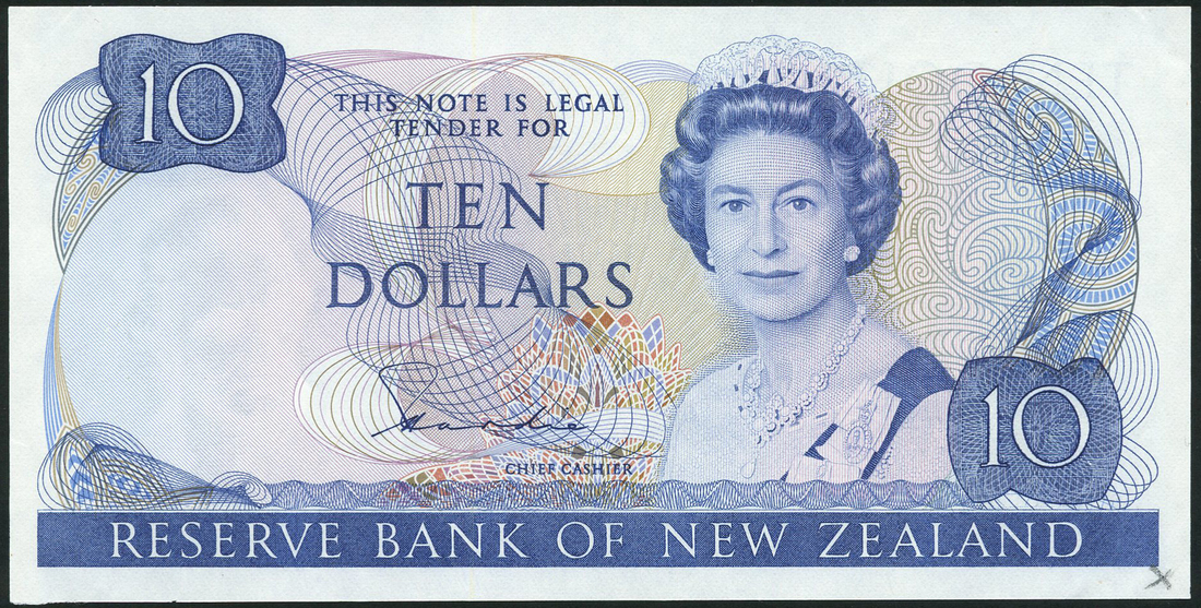 Reserve Bank of New Zealand, specimen proof $10, ND (1981), no serial numbers, signature H. R. Hardie, blue on multicoloured underprint, mature portrait of Queen Elizabeth II at right, reverse mountain lily at left, kea at centre