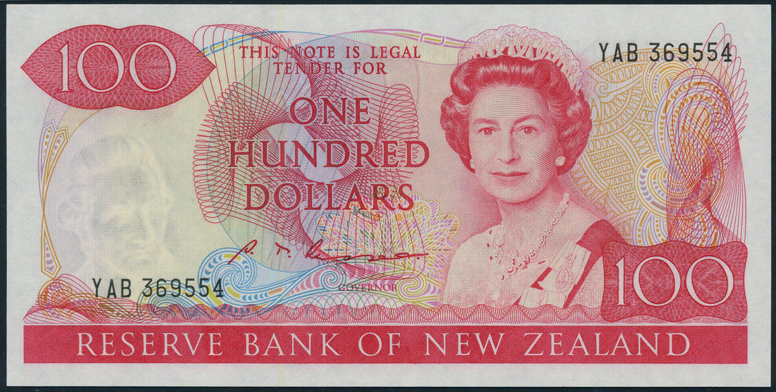 (x) Reserve Bank of New Zealand, $100, ND (1985-1989), prefix YAB, red and multicoloured, Elizabeth II at right, Russell signature