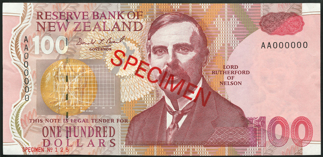 Reserve Bank of New Zealand, a full specimen set of the 1992-3 issue, comprising $5, orange-brown, Edmund Hillary at right, $10, blue, Kate Sheppard at right, $20, green, Elizabeth II at right, $50 purple, Sir Apirana Ngata at right, and $100, red, Lord Rutherford of Nelson at centre right, all with red SPECIMEN overprint