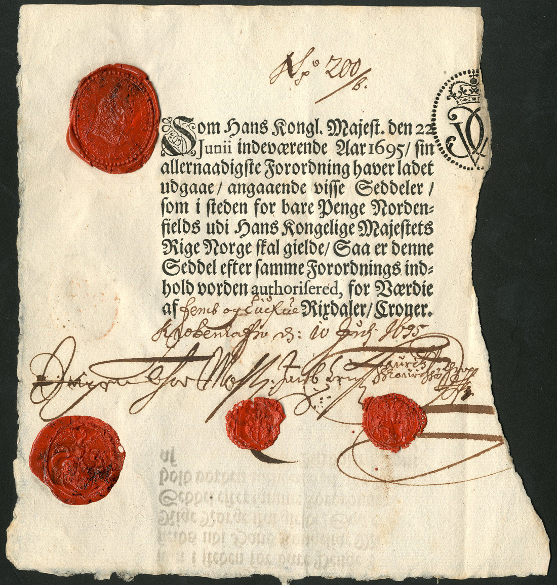 Norway, Thor Mohlen, 25 Rixdaler Kroner, 1695, serial number 200/B, black on cream paper with red wax seals, counterfoil removed and not present